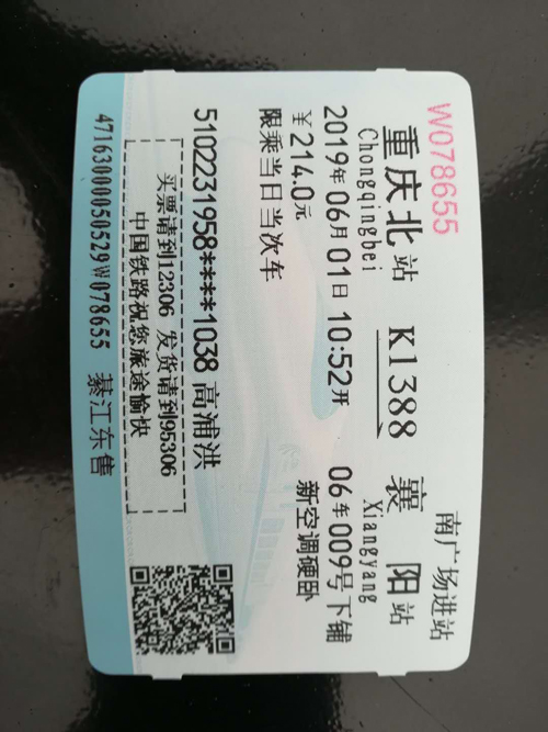 中国著名易经风水学者高浦洪,2019年6月1日乘火车重庆北至襄阳,去湖北省襄阳市为福主老板种生基。